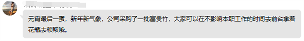 沒想到吧,你以為元宵活動(dòng)結(jié)束了,但其實(shí)大行政還為我們準(zhǔn)備了一批富貴竹,富貴竹在我們公司算是“老朋友”了,幾乎人人工位上都有那么幾株。通知發(fā)出后,大家井然有序地到前臺領(lǐng)取,不一會(huì)兒,一桶富貴竹就被領(lǐng)光了。