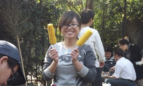章芳拿著兩個玉米棒,似乎是想分誰一個哦