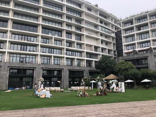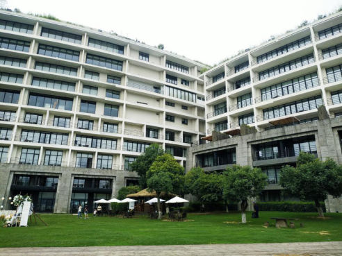 整個(gè)酒店抱湖而建,隱匿于山水之中